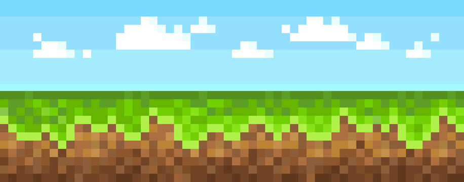 Pixel Art ground with sky background for 8-bit retro video game design. Seamless pattern land for platform arcade game level design. Pixelated vector illustration