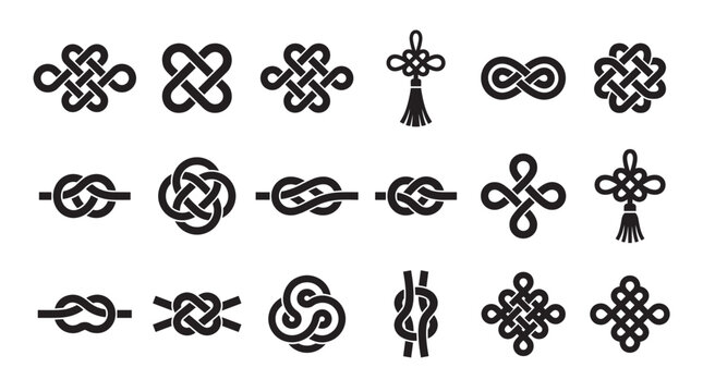 Set of eighteen black graphic knot symbols in various styles, from simple rope ties to complex decorative endless knots and traditional cultural tassels in a minimalist icon illustration