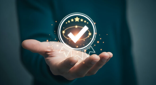 A person holding a digital icon representing quality assurance and customer satisfaction