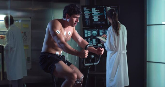 Cinematic shot of young athlete with medical electrodes doing endurance test of body resistance by training on gym cycle while physicians monitoring heart rate, pulse and ECG data in modern laboratory