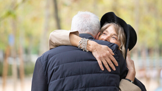 Senior woman embracing man outdoors, expressing enduring love and connection