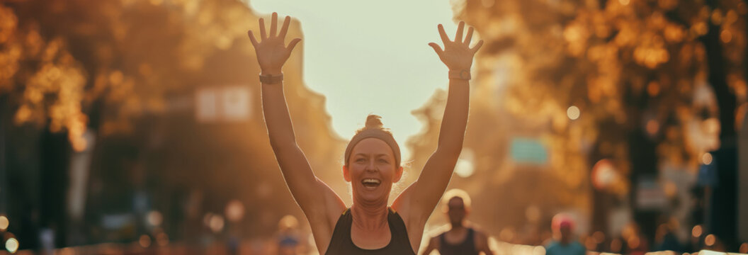 Woman crosses marathon finish line smiling, celebrating achievement. Runner reaches finish line, arms outstretched in victory. Athlete enjoys success after fitness competition.