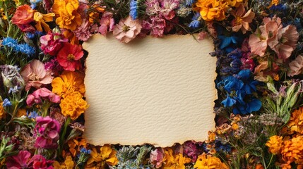 A vintage greeting card, its edges softened by time and wear, rests gently on a dried bouquet of wildflowers, their vibrant hues a testament to the enduring power of nature is artistry.
