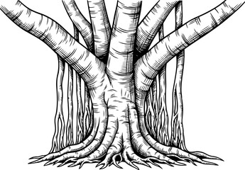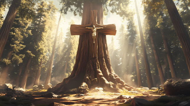 A cross carved into the trunk of a towering sequoia tree, surrounded by a grove of ancient giants, representing the enduring strength and resilience of faith throughout the ages. Sequoia. Illustration