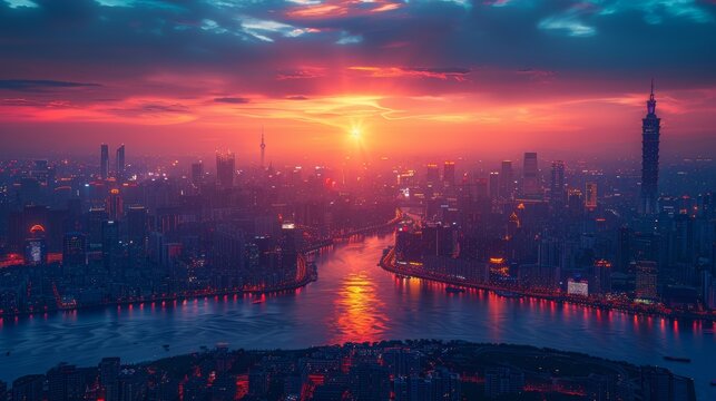 Vibrant cityscape featuring an expansive square, captured from an aerial view with dynamic lighting and energetic atmosphere in high definition.