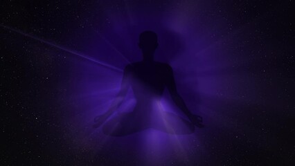Human figure in lotus yoga pose on space background in meditation concept. Animation video, 4k