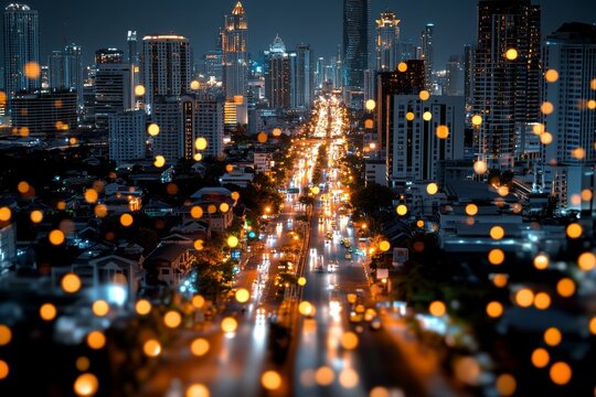 Abstract digital cityscape with vibrant neon lights and glowing particles creating a futuristic and energetic urban atmosphere for technology and innovation concepts