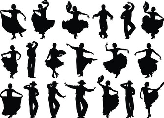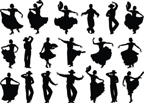 Diverse silhouettes of dancers in traditional mexican folk costumes performing various energetic movements