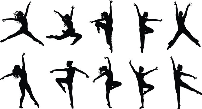 Silhouette of dancers in various poses and movements, energetic ballet and modern dance figures, artistic body language and graceful dance illustration for fitness and performance concept