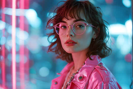 A woman in a pink jacket and glasses is standing in front of a neon sign