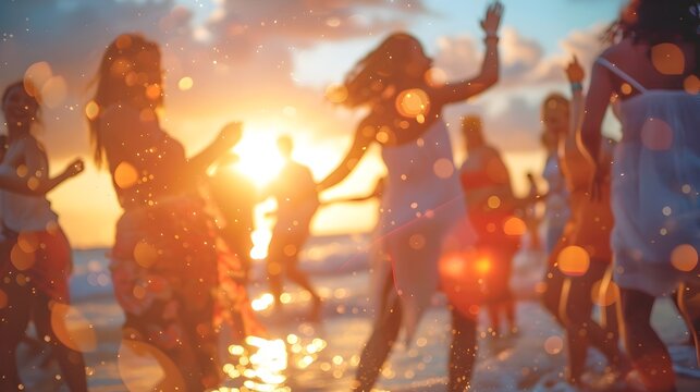 Blurred Sunset Beach Party with Joyful Friends Dancing