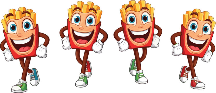 Happy running french fries mascot characters, cheerful cartoon fast food icons, fun energetic snack illustration for branding, advertising, menus, promotions