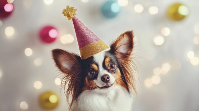 A jubilant Papillon celebrating New Year 2025. Featuring vibrant party hats and decorations