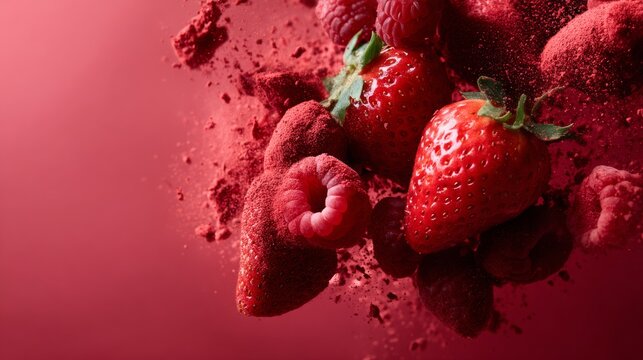 Frozen berries splash in air on pink background for energetic fruit branding and dynamic photography food composition