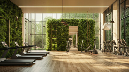 A nature-inspired gym design that integrates living green walls, natural wood accents, and large windows to create a refreshing and energizing workout space Generative AI