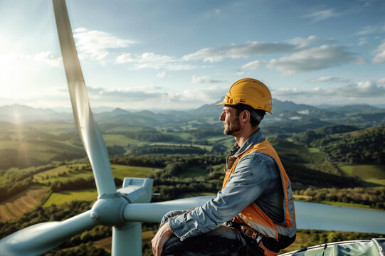 Wind energy revolution engineer inspecting turbine renewable energy site outdoor perspective clean energy tech advancement