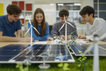 Students collaborate on renewable energy project using solar panels and wind turbines