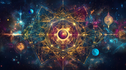 Abstract art of sacred geometry shapes with stars, planets, and a mystical aura, symbolizing spiritual connection, cosmic energy, balance, enlightenment, and celestial power. Celestial. Illustration