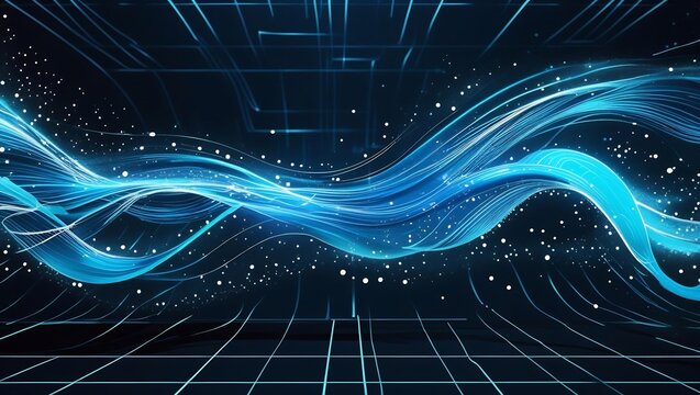 Futuristic digital wave background with glowing blue and cyan flowing lines, particle trails, light dots, and motion blur, dark tech grid background, high contrast style.