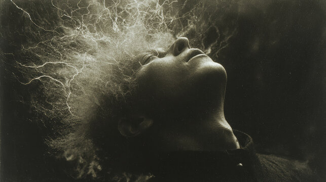 Surreal portrait man lightning hair abstract energy dramatic light contrast fantasy mood
