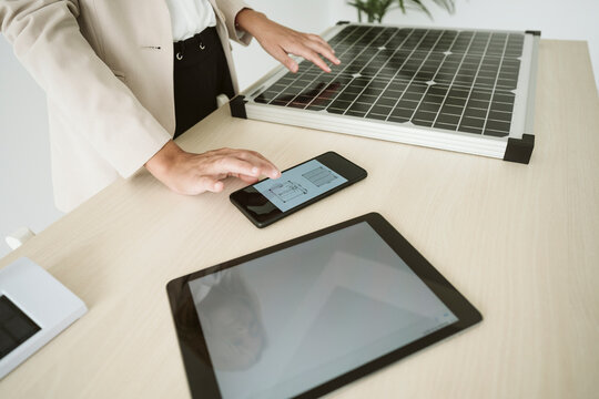 Woman in office with solar panel on desk using mobile phone