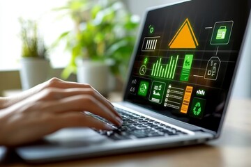 Home improvement concept, Hand of businessman using laptop with energy efficiency rating, ecological and bioenergetic house, efficiency scale.