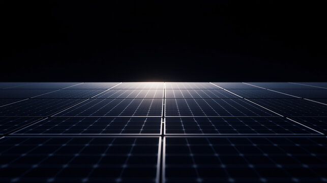 Energy Horizon: A grid of solar panels stretches towards the horizon, symbolizing clean energy and technological advancement. Photorealistic with emphasis on sustainable power.