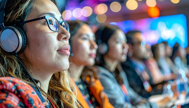 Diverse Audience Attendees Listening to a Speaker at a Large Conference, A diverse audience gathered in a large conference hall, listening attentively to a speaker