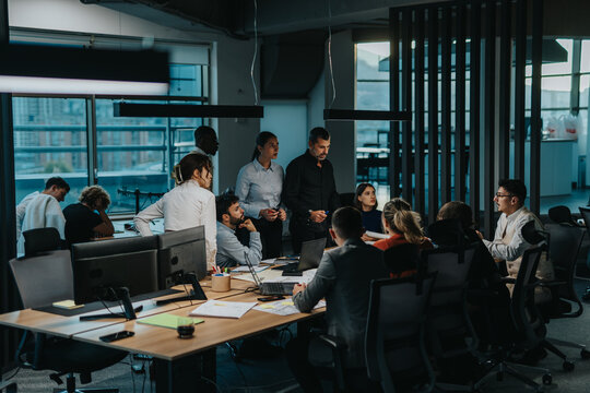 Diverse business professionals in a modern office engaged in a collaborative meeting, listening, brainstorming and strategizing ideas for innovation, growth and successful teamwork
