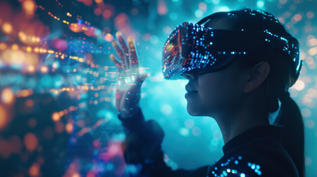 A teenager wearing a brain-computer interface device with electrodes, deeply engaged in a virtual reality game, highlighting the integration of technology with the human mind.