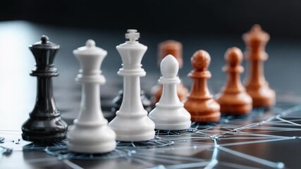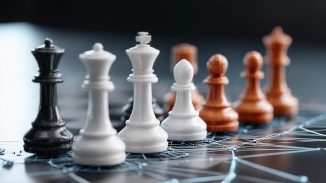 Strategic Standoff: Intricate chess pieces on a board, each piece positioned, ready to engage in a battle of intellect, strategy, and precision. Capturing the complexity and the silent tension.