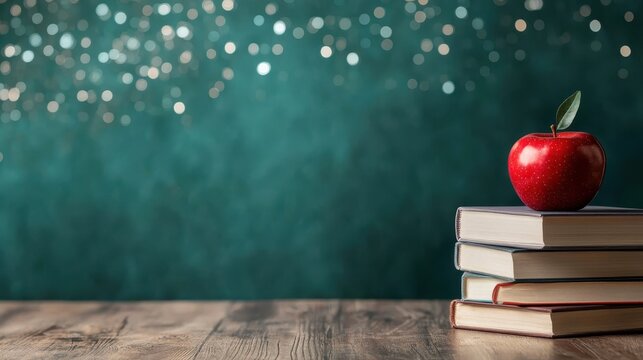 A classic still-life arrangement featuring stacked books topped with a shiny red apple, symbolizing knowledge and creativity, inviting viewers to engage with learning and exploration.