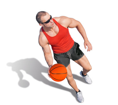 A confident and talented young asian business executive in a full suit. A pro basketball player in formal attire. Zoomed in ball. Isolated on a white background.