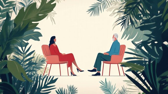 Two individuals sit comfortably in a cozy living room with warm lighting, surrounded by plants and books, engaged in a friendly conversation.