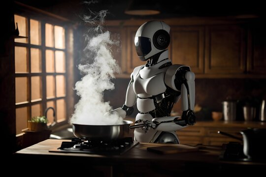 A humanoid robot is engaged in cooking inside a warm and inviting kitchen. Steam billows from a pot on the stove, creating a cozy atmosphere during the evening.