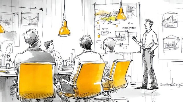 A professional meeting in a modern office setting with participants engaged in discussion and b