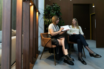 Two women engaged in a professional discussion in a modern office setting with stylish furniture and greenery