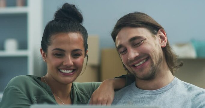 Couple, video call and ring for engagement at home, smile and communication on technology. Interracial love, laugh and happy for jewelry, share and announcement or news online, talking and network