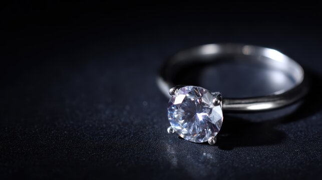 diamond engagement ring displayed on black backdrop, sparkling gemstone, minimalist and classy presentation