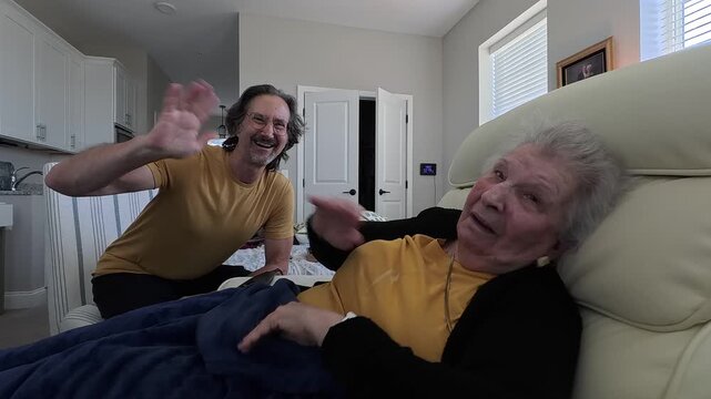 Elderly man with gray hair and beard holds a green square card, showcasing expressions and gestures, as the camera smoothly pans and zooms in to capture the scene's emotional depth and engagement