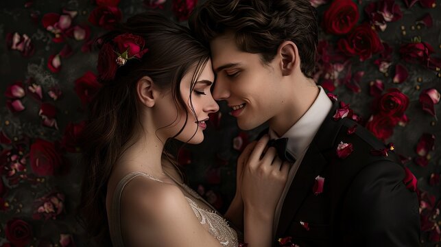 Romantic couple surrounded by red rose petals embrace.