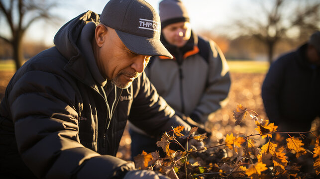 Volunteers actively participating in a park cleanup during autumn, gathering trash in bags surrounded by vibrant orange and yellow leaves. The image highlights community engagement and environmental