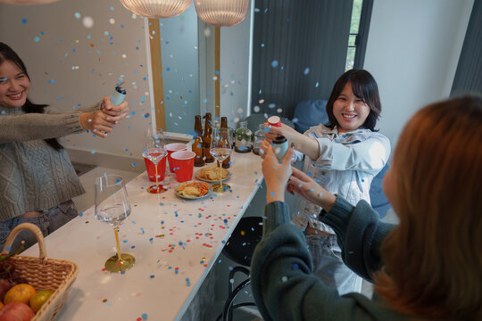 Party Fun. Friends celebrating with confetti and drinks at a lively gathering.