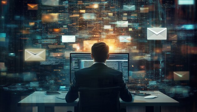 A businessman using an e-commerce platform on his laptop, with virtual product icons and delivery options enhancing the online shopping experience