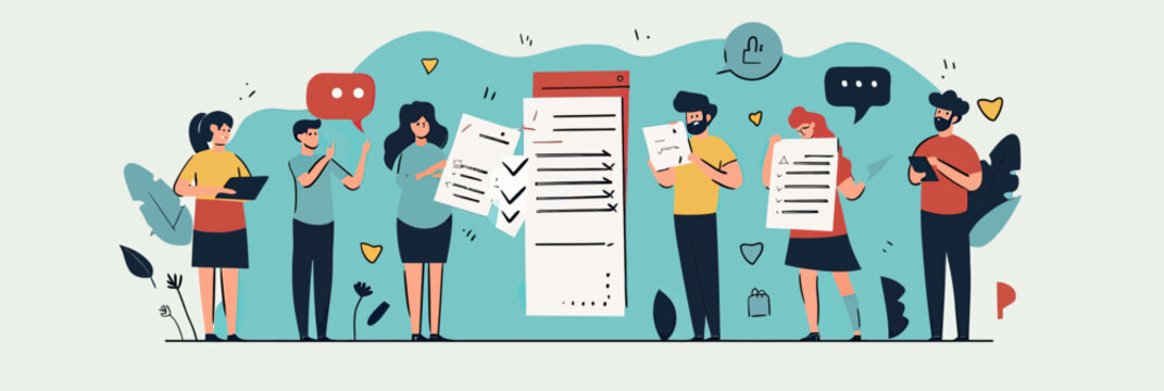 Diverse group of people holding and reviewing customer feedback forms with speech bubbles and rating icons in flat minimalistic vector illustration style
