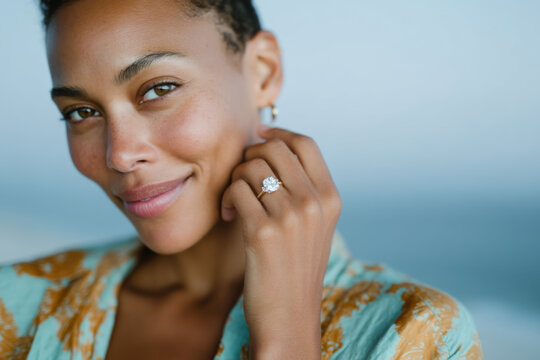 Beautiful woman showing engagement ring and smiling at beach