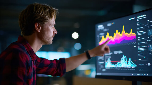 Man analyzing data on large screen with colorful graphs in dark room, showing focus and engagement in data analysis or research, with modern technological environment