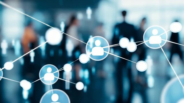 Abstract digital network visualization shows connections among silhouettes of people, creating a dynamic scene of interaction and engagement
