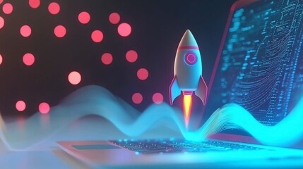 This engaging image shows a bold rocket emitting data waves from a laptop interface, visually representing the intersection of technology, exploration, and digital evolution.