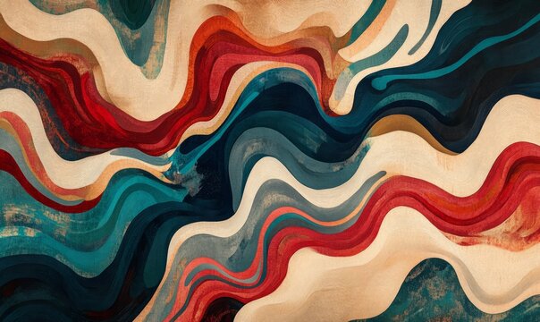 An abstract design featuring flowing, wavy patterns in rich hues of red, blue, beige, and teal, creating a dynamic and visually engaging composition with a sense of movement and depth